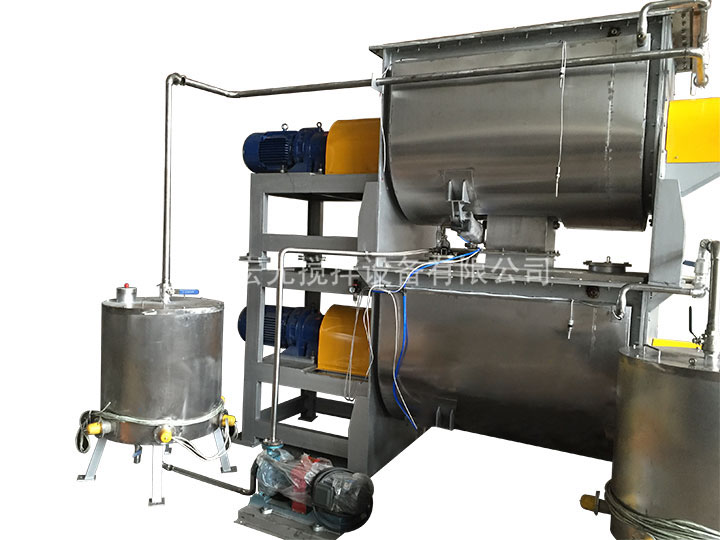 6、加液霧化裝置:對(duì)不同粘稠度的液體物料進(jìn)行霧化,使加入液體物料混合均勻(噴灑狀)。